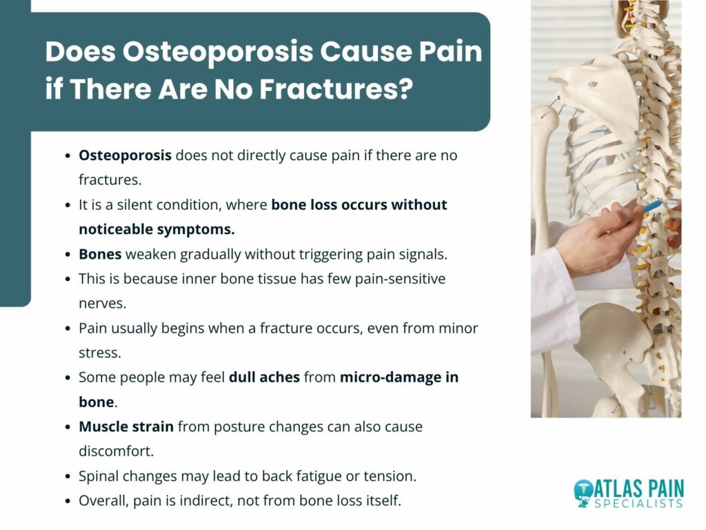 No, osteoporosis does not directly cause pain if there are no fractures. Osteoporosis is fundamentally a metabolic skeletal disorder defined by reduced bone strength and an increased risk of fracture.