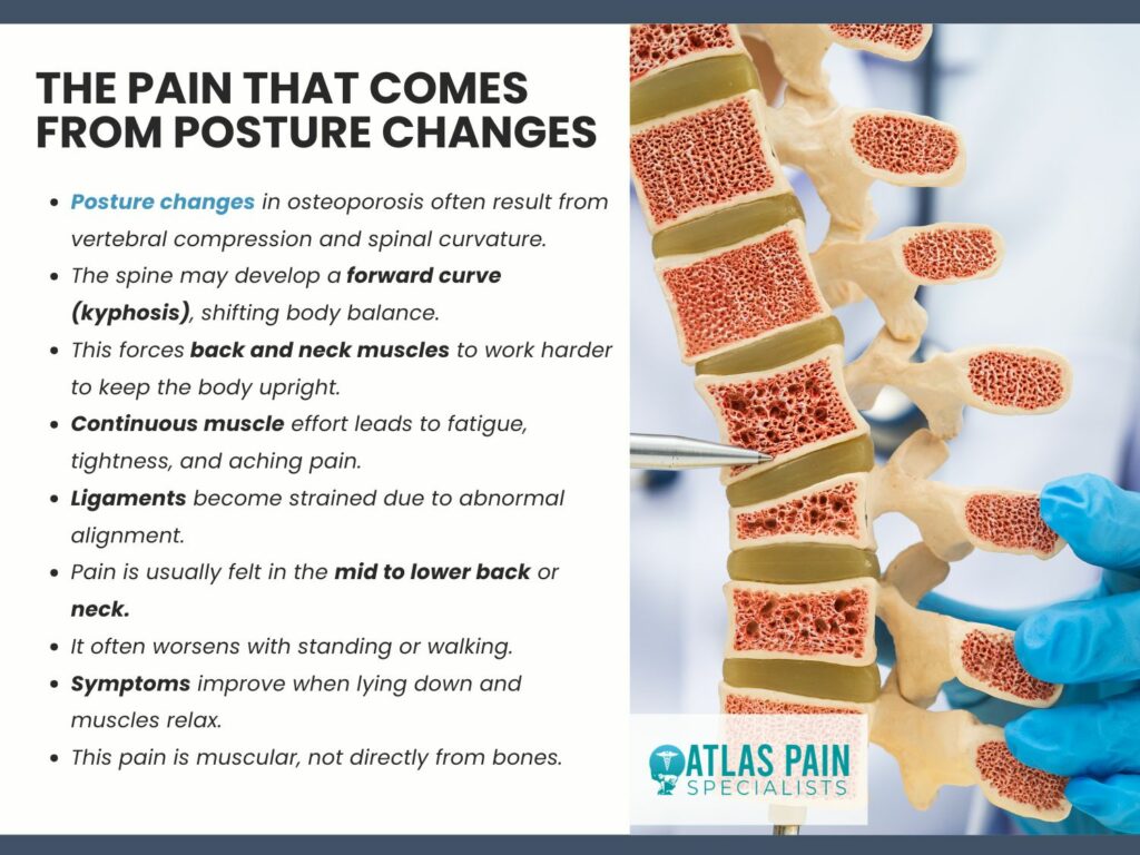 As osteoporosis progresses, structural changes within the spine can lead to significant alterations in posture. These changes do not directly cause bone pain but instead create secondary mechanical strain on muscles, ligaments, and joints, resulting in persistent discomfort and functional limitations.