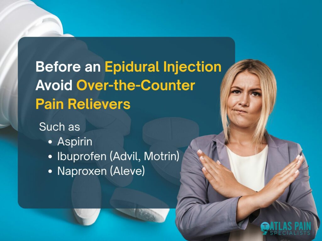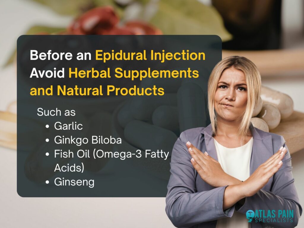 What not to take before an epidural injection? Certain common foods, supplements, and medications can directly counteract the body's natural clotting mechanisms or alter its response to emergency medications. Failure to observe these restrictions may result in the postponement of the procedure for medical reasons.
